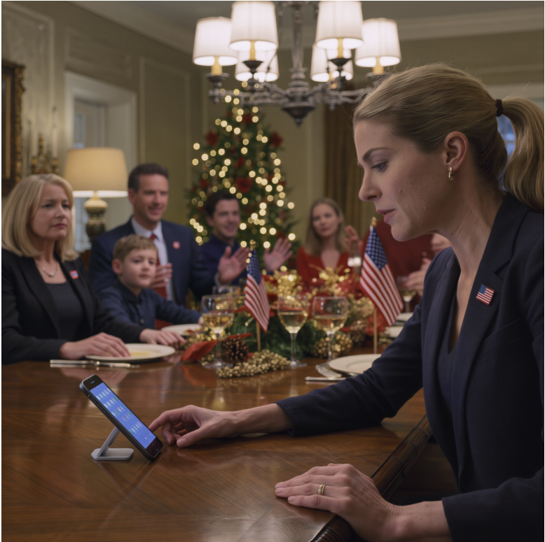 Frank Sinatra fredonnait sur la platine du salon – à un volume suffisamment bas pour être « chic », mais assez fort pour affirmer le standing de la maison. La lueur des bougies vacillait sur les verres en cristal et la porcelaine importée. Un aimant américain drapeau sur le réfrigérateur en inox captait un éclat fugace provenant du sapin de la pièce voisine, comme si la cuisine avait besoin d’une preuve de son appartenance à Bellevue.