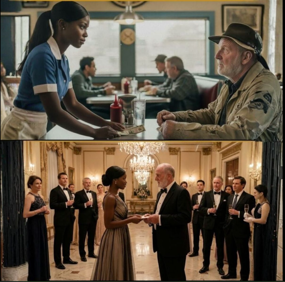Lo deslizó sobre la mesa. No se movió suave. La mesa estaba pegajosa por jarabe viejo y limpiezas mal hechas. El billete se detuvo frente a Naomi como un reto.