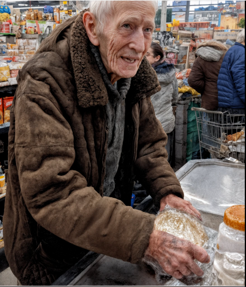 Il paraissait petit, légèrement voûté, avec une veste passée qui avait connu de bien meilleures décennies. Ses mains tremblaient tandis qu’il posait sur le tapis une miche de pain, un pot de beurre de cacahuète et une petite brique de lait — des produits tellement essentiels que ça faisait presque mal de les regarder.