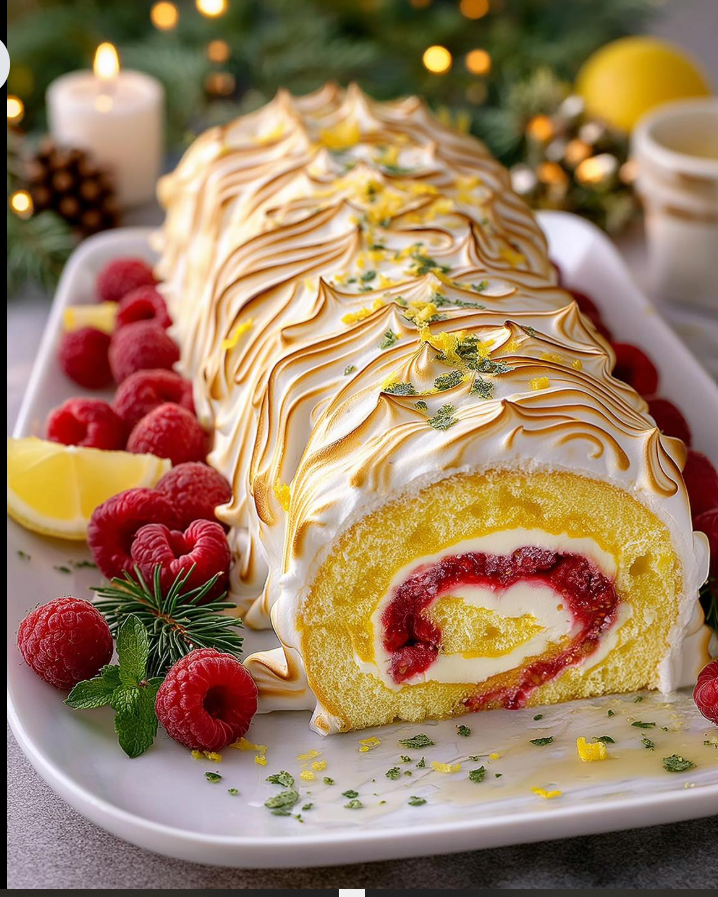 This lemon and raspberry rolled cake is a fresh, elegant dessert that combines light sponge, tangy lemon curd, and the sweetness of Italian meringue. The soft biscuit is gently rolled while warm to preserve its flexibility, then filled with smooth lemon cream and bursts of fresh raspberries. Finished with a glossy, lightly torched meringue, this dessert offers a balanced contrast of textures and flavors, making it ideal for celebrations or refined gatherings.
