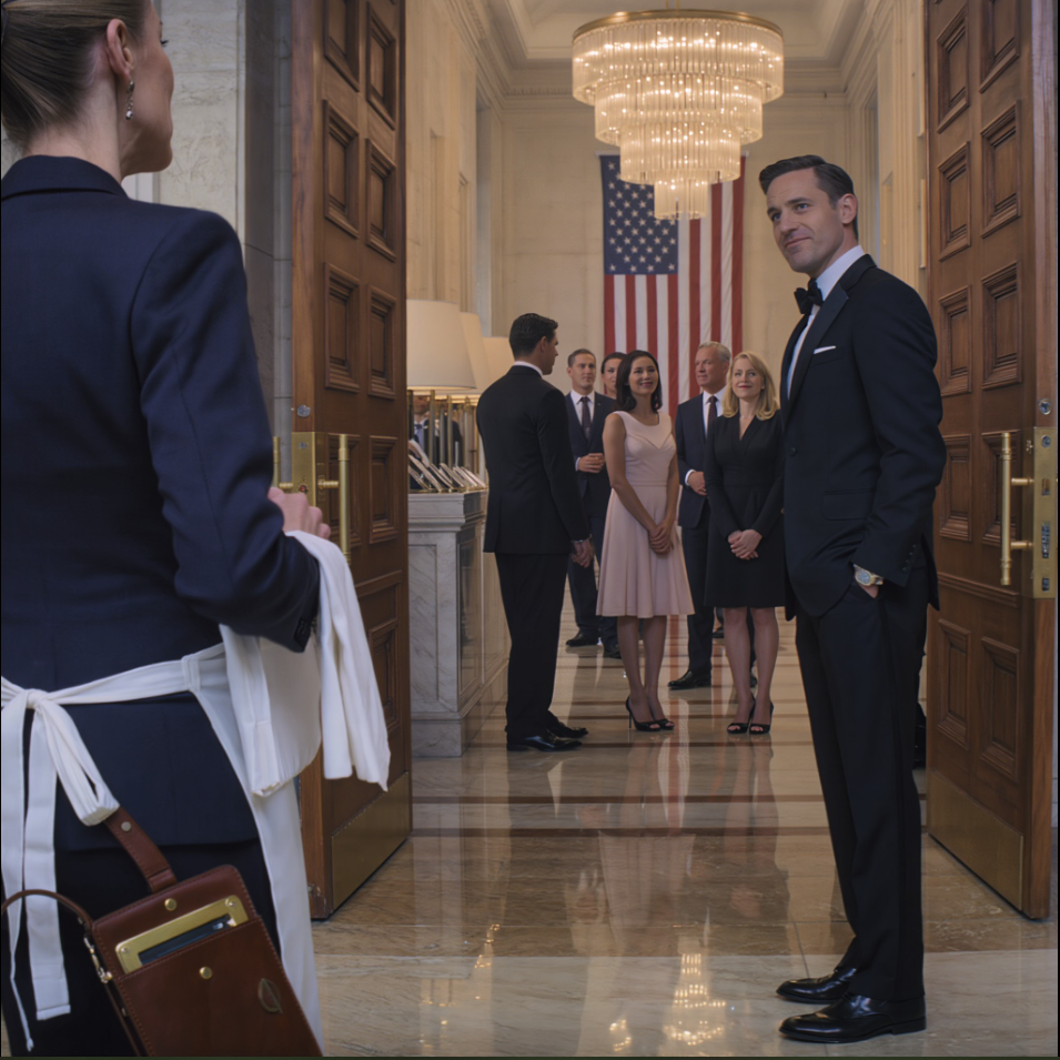 Le hall était en marbre et silencieux, orné de lustres et de vieux portraits d’hommes qui n’avaient jamais douté de leur importance. À peine avais-je franchi le seuil qu’un chef d’étage, casque sur les oreilles et le regard affolé d’un homme comptant les catastrophes à la minute, me bouscula.