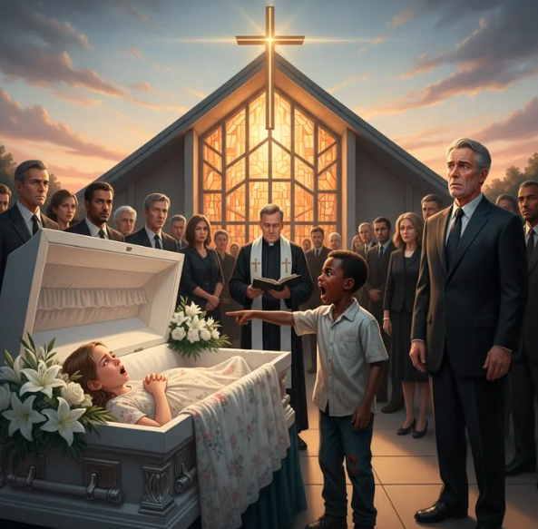 Au moment où les lourdes portes en bois de l’église s’ouvrirent brusquement, tous les regards se tournèrent vers l’assistance. Les funérailles s’étaient déroulées dans le silence – un milliardaire pleurant la perte de sa fille unique – mais le calme fut rompu lorsqu’un jeune garçon noir, maigre et vêtu de haillons, dévala l’allée en courant, criant d’une voix tremblante : « Ne l’enterrez pas ! Votre fille est encore vivante ! »