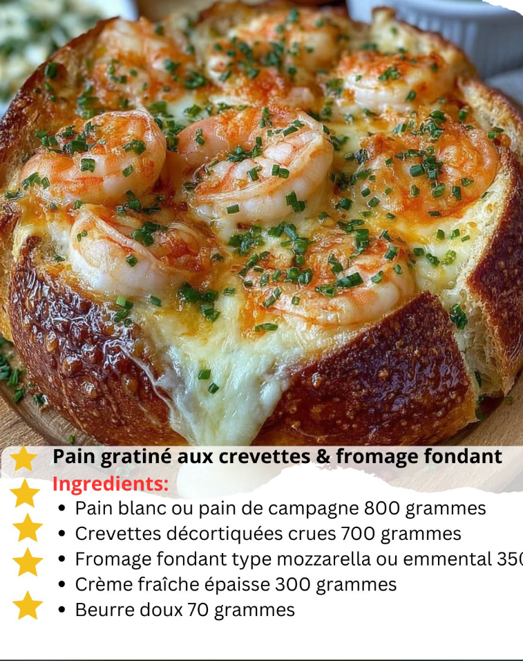 Présentation générale du pain gratiné aux crevettes et fromage fondant