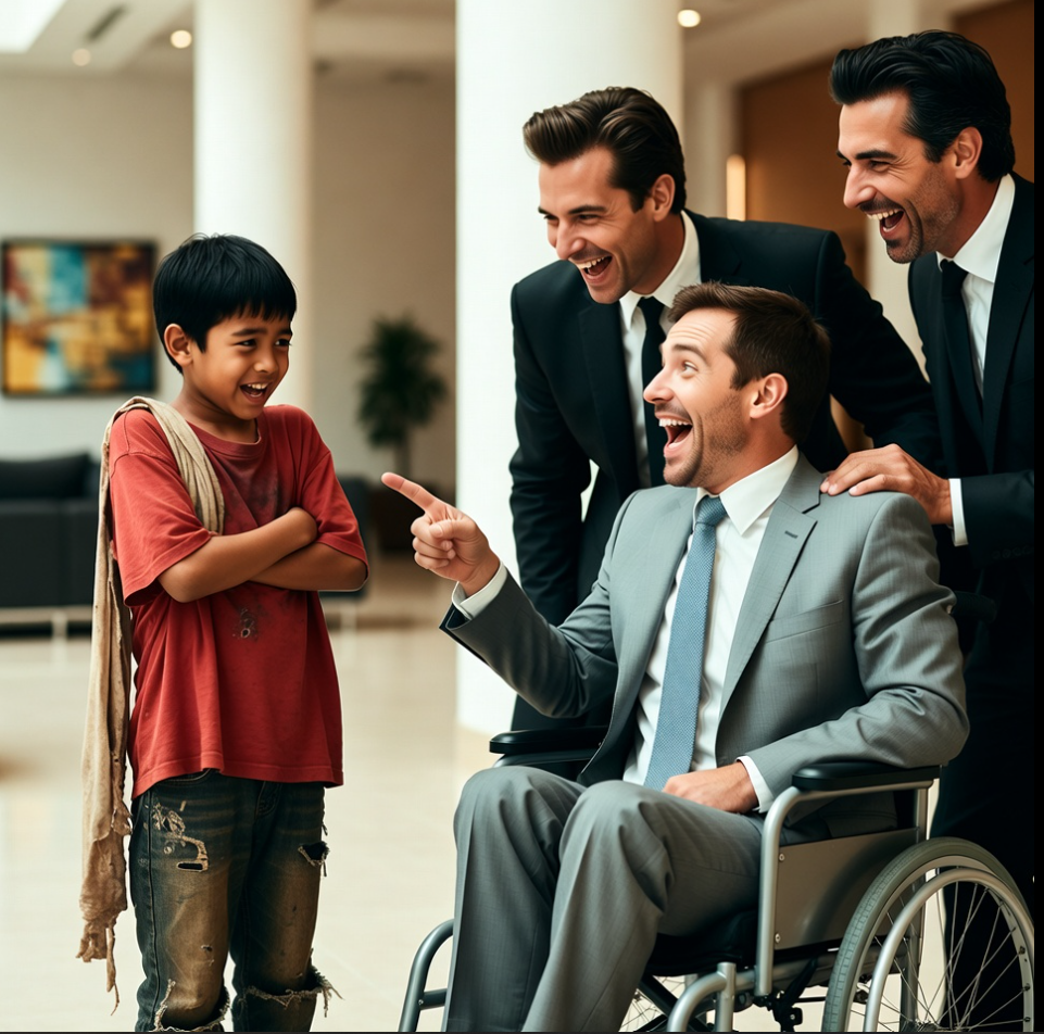 Il posa le pied nu sur le marbre étincelant, et les rires des hommes en costume résonnèrent. Mais le garçon ne demanda ni argent, ni excuses. Il désigna le fauteuil roulant du propriétaire et murmura : « Je peux vous faire marcher. » À cet instant, le temps sembla s’arrêter. Et personne n’imaginait le prix à payer.