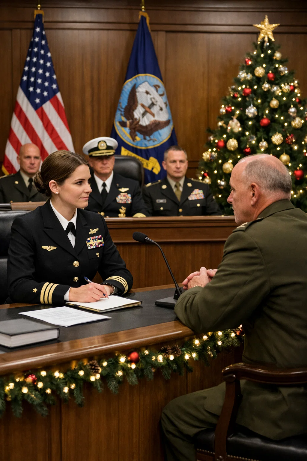 Une jeune marine est assise seule dans une salle d’audience militaire, entourée d’officiers supérieurs qui la dévisagent comme si elle n’avait rien à y faire. Le général qui préside l’audience se penche en avant avec un sourire narquois et lui pose une question destinée à l’humilier devant tout le monde.