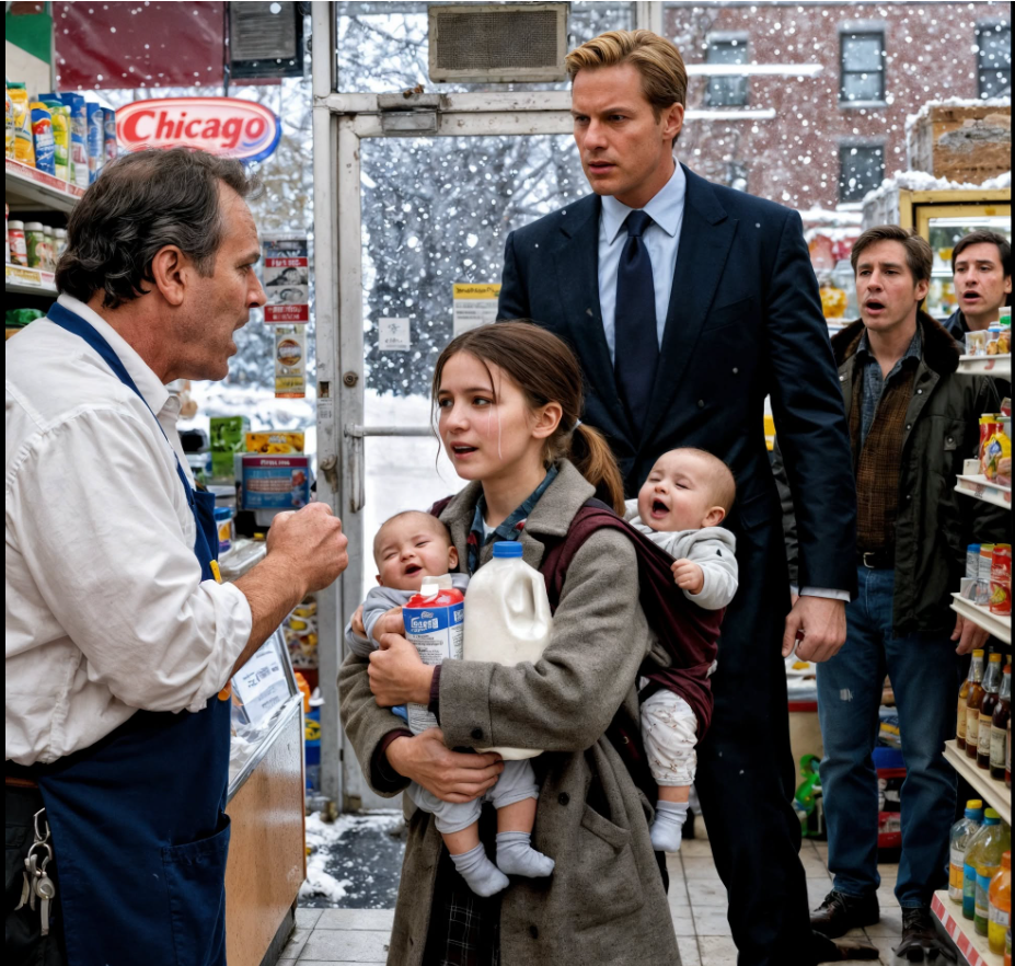 À cet instant, un homme grand, portant un manteau de laine sombre, fit un pas en avant. « Attendez, » dit-il d’un ton calme mais ferme. Tous le reconnurent aussitôt — Daniel Whitmore, un promoteur immobilier bien connu du quartier. « Combien coûte le lait ? » demanda-t-il. M. Roberts cligna des yeux. « Deux dollars, » répondit-il. Daniel sortit son portefeuille, lui tendit un billet de vingt et ajouta : « Gardez la monnaie. » Puis il se tourna vers Emily. « Viens, » dit-il doucement.